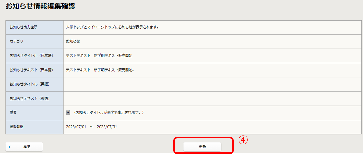 内容に間違いがなければ「更新」ボタンをクリックしてください。