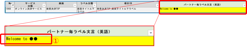「マスタファイル」の修正手順は「お問い合わせ先(日本語)を変更する」手順と同様です。 →『10-4-2 ログインページの「お問い合わせ先(日本語)」を変更する』 ラベルマスタファイル(エクセル形式)項目ID: 『雑費決済_ログイン_お問い合わせ先』 →『パートナー毎ラベル文言(英語)』を修正します。 ※ラベルマスタファイル内で項目IDを検索してください ①お問い合わせ先 この部分を適切な内容に修正します。