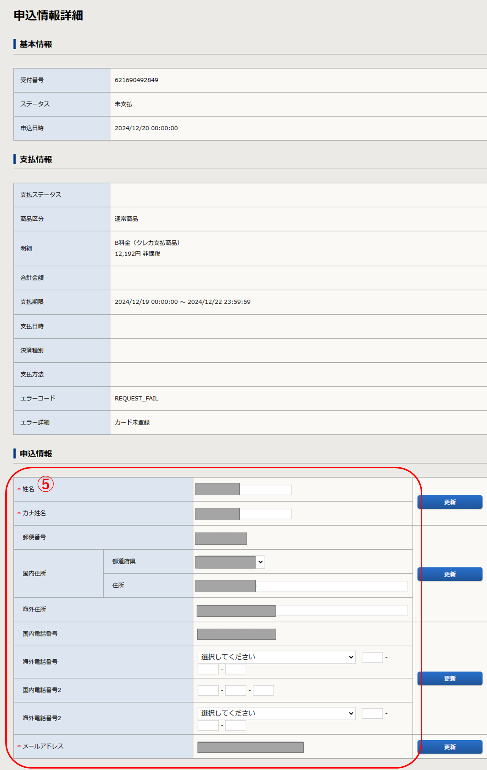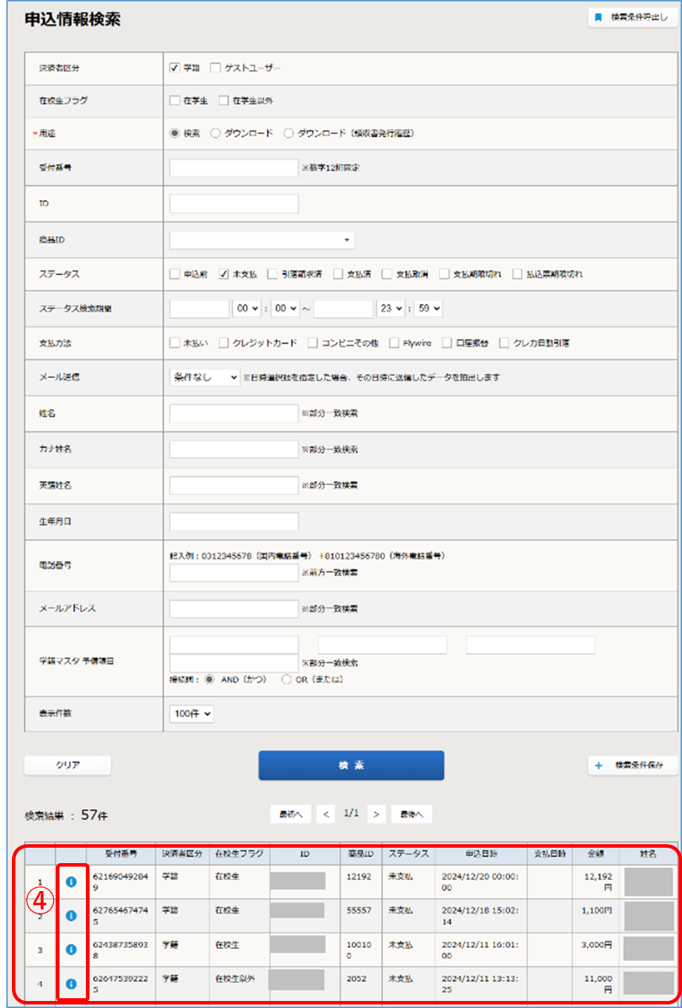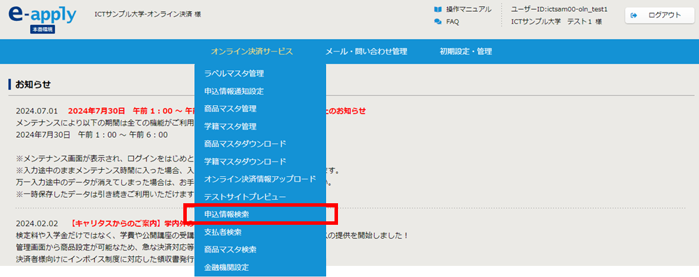 1.トップページ「オンライン決済サービス」 >「申込情報検索」を選択します。