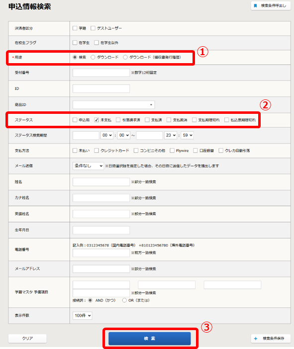 条件を設定して「検索」ボタンをクリックすると、条件入力覧の