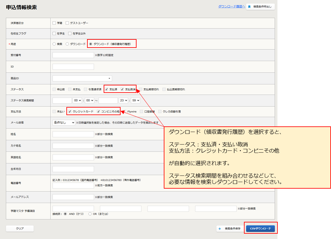 検索条件を選択・登録後、CSVダウンロードをクリックします。
