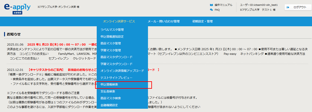 1.トップページ「オンライン決済サービス」>「申込情報検索」を選択します。