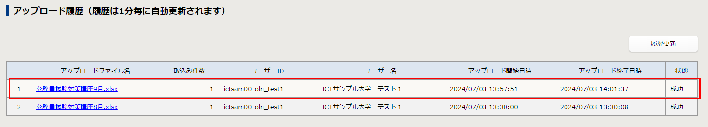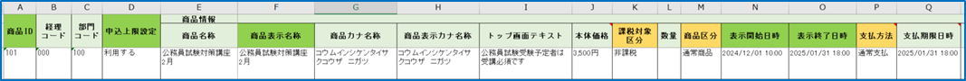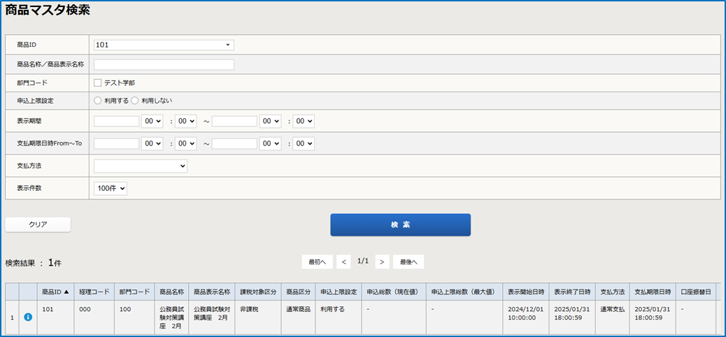先ほどアップロードした商品(商品ID 101 公務員試験対策講座 9月)を検索します