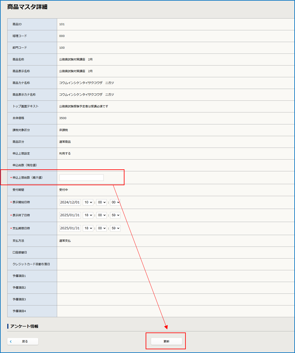 申込上限数(最大値) の項目へ適切な数値を入れ ページ下部の「更新」ボタンをクリックします