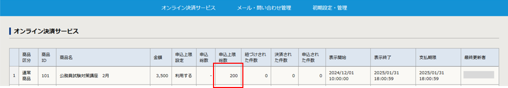 申込上限数(在庫・定員)が設定されていることが確認できます