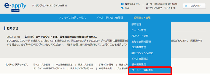 トップページ「初期設定・管理」 >「パートナー情報参照」から確認できます。