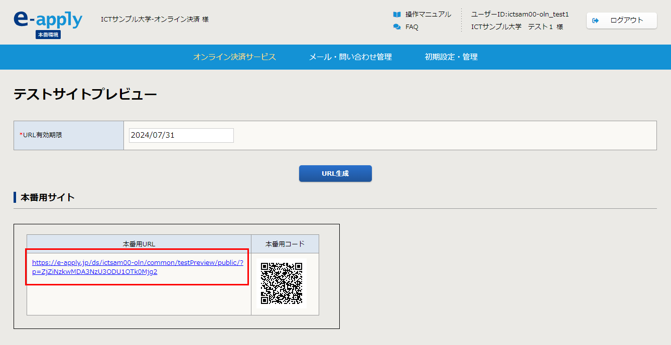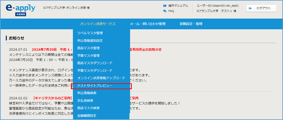 2.トップページ「オンライン決済サービス」 >「テストサイトプレビュー」を選択します。