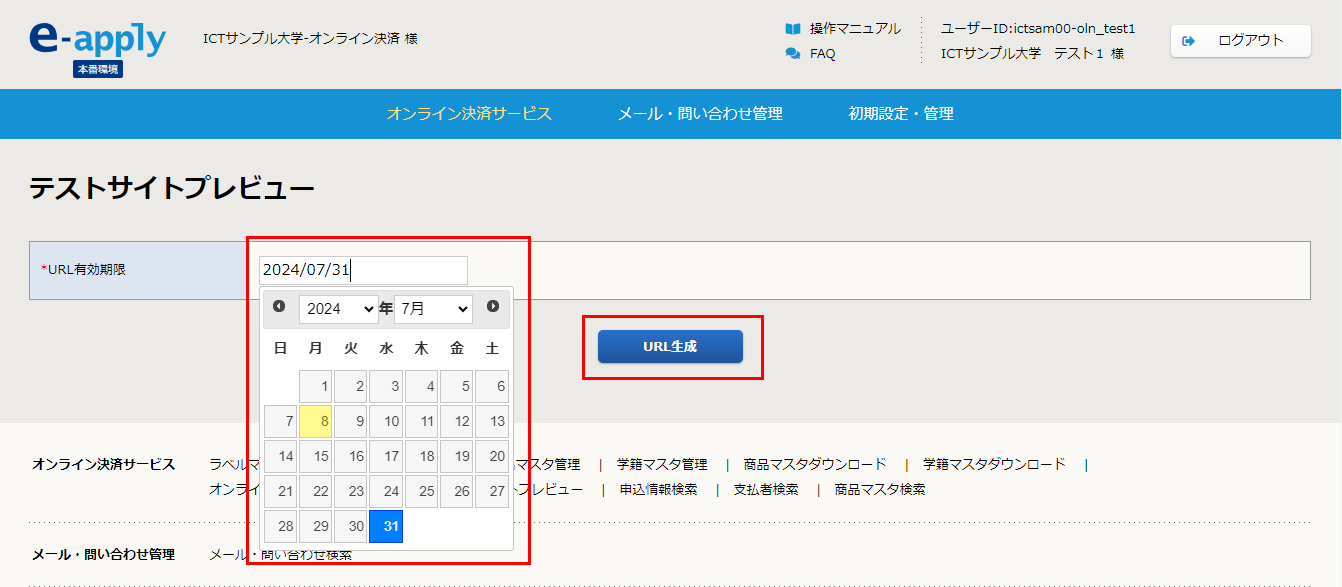 3.カレンダーでテストサイトプレビューのURL有効期限を設定し、「URL生成」ボタンをクリックします。